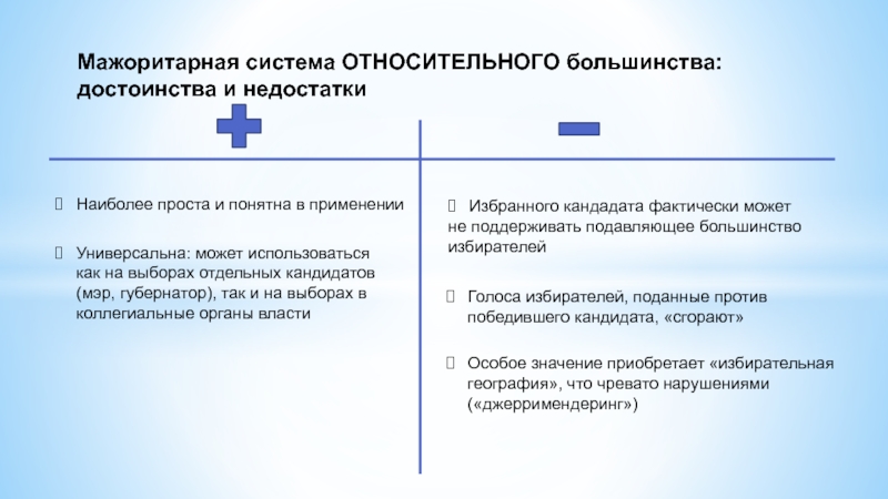 Слайд 9Мажоритарная система ОТНОСИТЕЛЬНОГО большинства:
