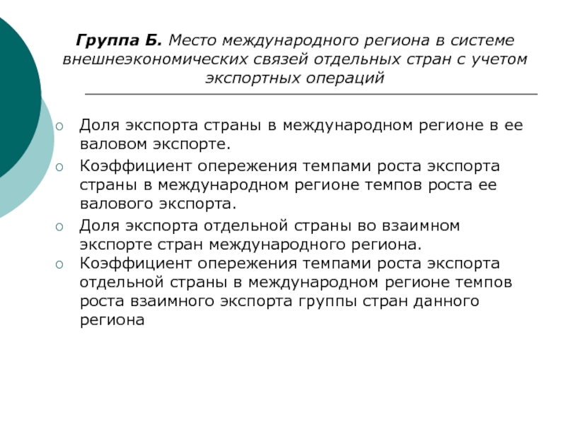 Слайд 15Группа Б. Место международного региона в системе внешнеэкономических связей отдельных
