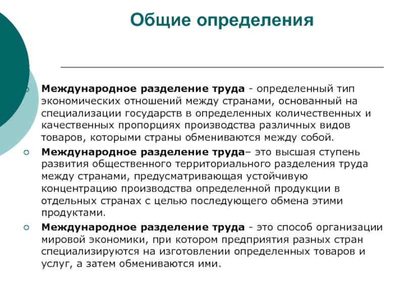 Международное разделение труда– это высшая ступень развития общественного территориального разделения труда между странами, предусматривающая устойчивую концентрацию производства определенной продукции в отдельных странах с целью последующего обмена этими продуктами.