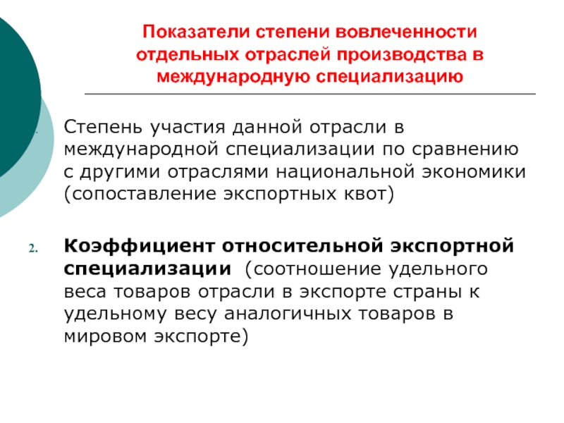 Слайд 11Показатели степени вовлеченности отдельных отраслей производства в международную специализацию
