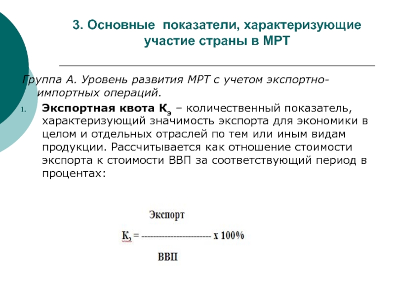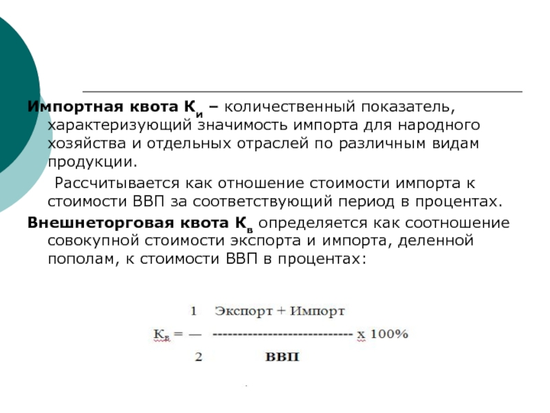 Внешнеторговая квота Кв определяется как соотношение совокупной стоимости экспорта и импорта, деленной пополам, к стоимости ВВП в процентах: