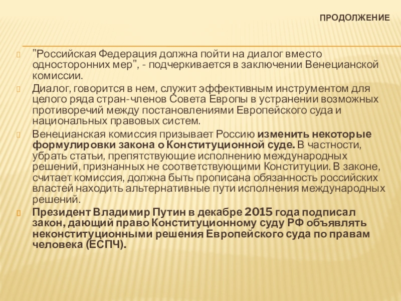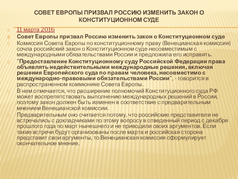 Слайд 79Совет Европы призвал Россию изменить закон о Конституционном суде