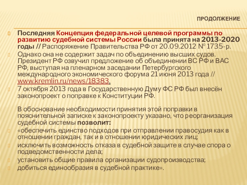 Однако она не содержит задач по объединению высших судов. Президент РФ озвучил предложение об объединении ВС РФ и ВАС РФ, выступая на пленарном заседании Петербургского международного экономического форума 21 июня 2013 года // www.kremlin.ru/news/18383.