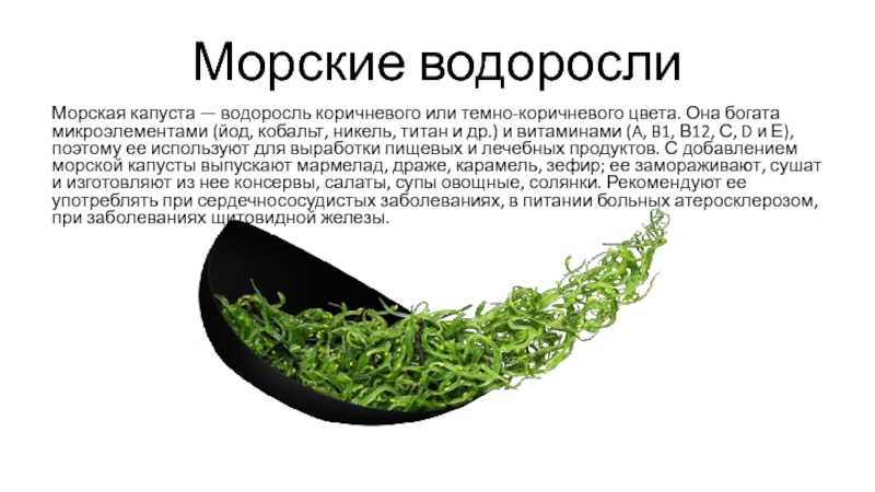 (A, B1, В12, С, D и Е), поэтому ее используют для выработки пищевых и лечебных продуктов. С добавлением морской капусты выпускают мармелад, драже, карамель, зефир; ее замораживают, сушат и изготовляют из нее консервы, салаты, супы овощные, солянки. Рекомендуют ее употреблять при сердечнососудистых заболеваниях, в питании больных атеросклерозом, при заболеваниях щитовидной железы.