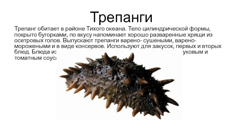 голов. Выпускают трепанги варено- сушеными, варено-морожеными и в виде консервов. Используют для закусок, первых и вторых блюд. Блюда из трепангов хорошо сочетаются с огуречным, луковым и томатным соусами.
