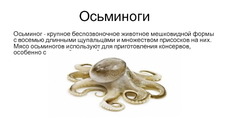 длинными щупальцами и множеством присосков на них. Мясо осьминогов используют
