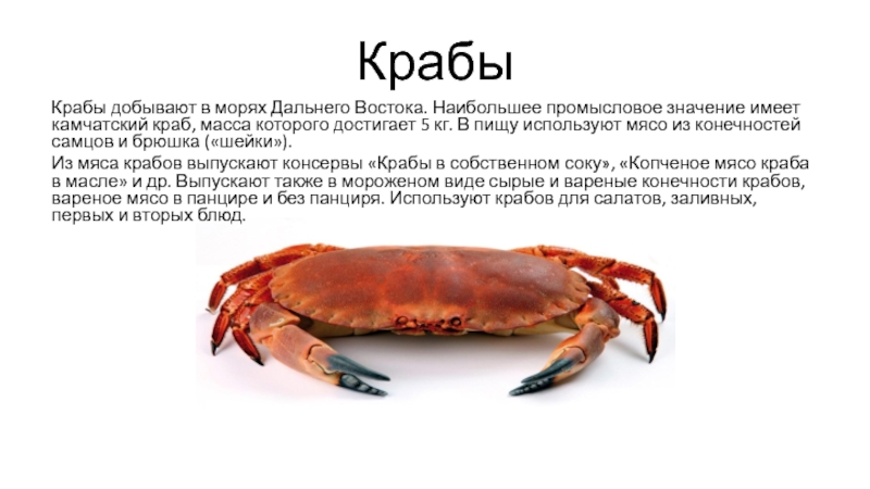 Крабы добывают в морях Дальнего Востока. Наибольшее промысловое значение имеет