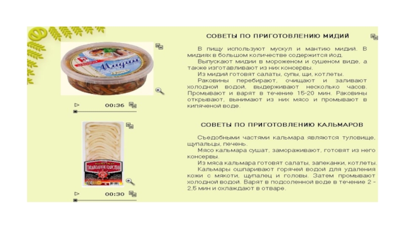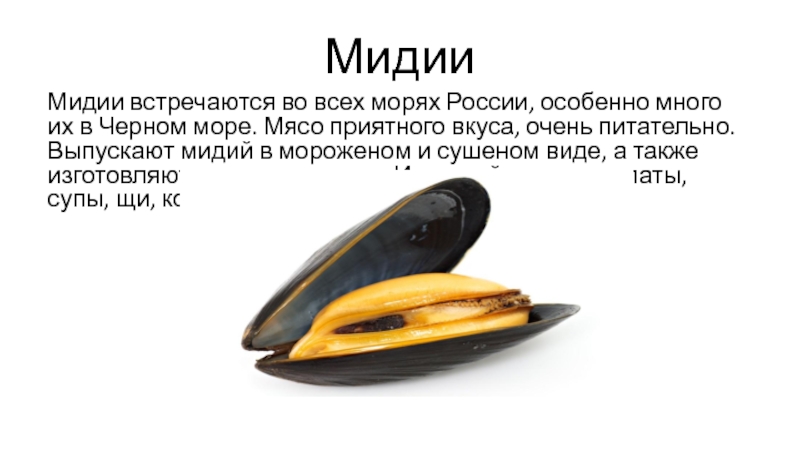 в мороженом и сушеном виде, а также изготовляют из них консервы. Из мидий готовят салаты, супы, щи, котлеты.