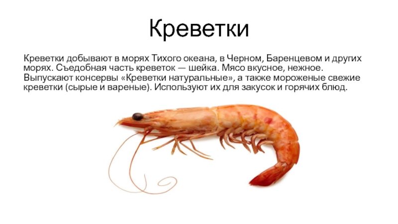 других морях. Съедобная часть креветок — шейка. Мясо вкусное, нежное.