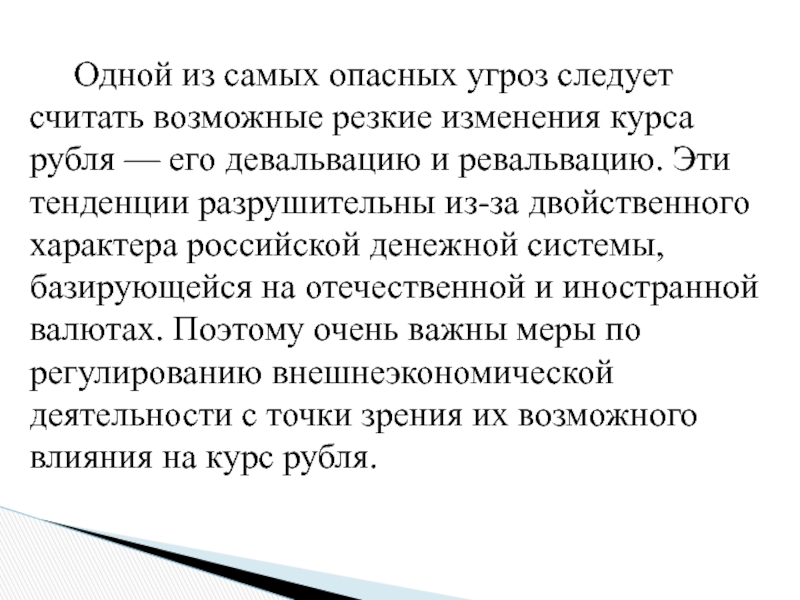 Эти тенденции разрушительны из-за двойственного характера российской денежной системы, базирующейся на отечественной и иностранной валютах. Поэтому очень важны меры по регулированию внешнеэкономической деятельности с точки зрения их возможного влияния на курс рубля.
