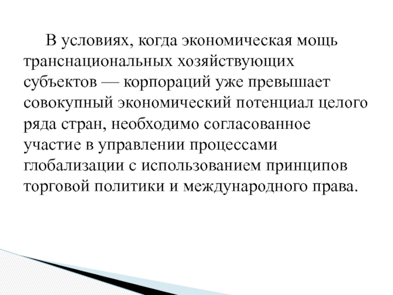 Слайд 9 В условиях, когда экономическая мощь транснациональных хозяйствующих