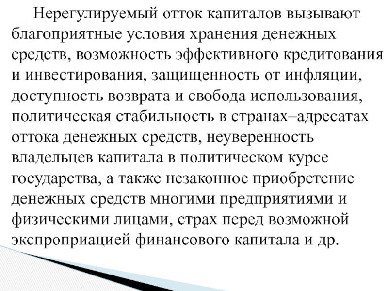 доступность возврата и свобода использования, политическая стабильность в странах–адресатах оттока денежных средств, неуверенность владельцев капитала в политическом курсе государства, а также незаконное приобретение денежных средств многими предприятиями и физическими лицами, страх перед возможной экспроприацией финансового капитала и др.