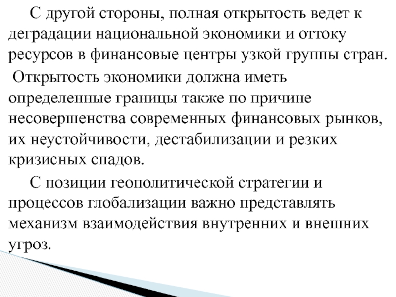 Открытость экономики должна иметь определенные границы также по причине несовершенства современных финансовых рынков, их неустойчивости, дестабилизации и резких кризисных спадов.