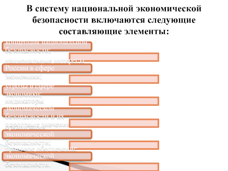 Слайд 26В систему национальной экономической безопасности включаются следующие составляющие элементы:
