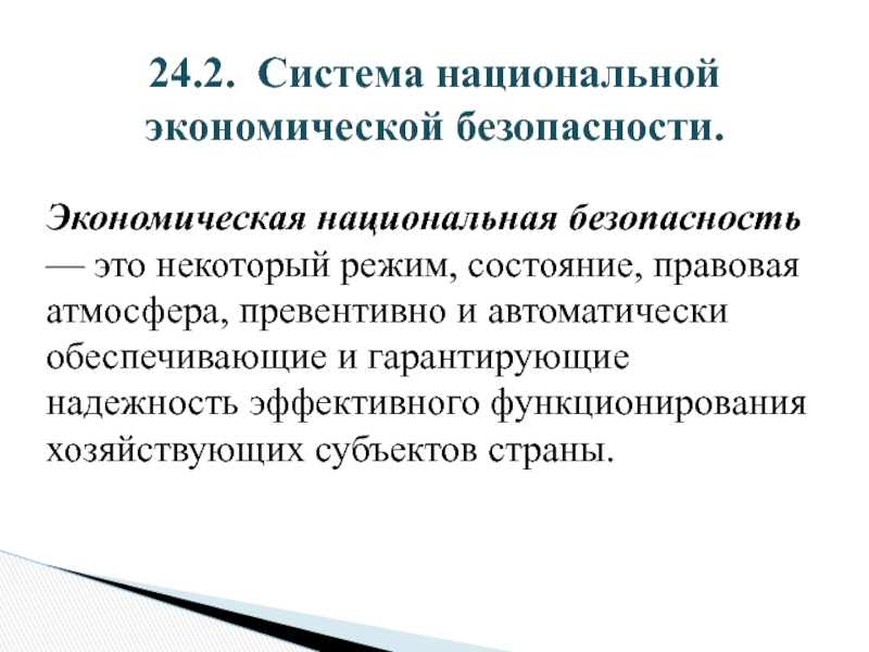Слайд 21Экономическая национальная безопасность — это некоторый режим, состояние, правовая атмосфера,