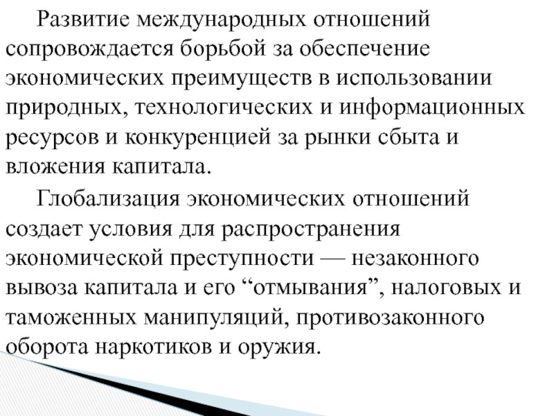 Глобализация экономических отношений создает условия для распространения экономической преступности — незаконного вывоза капитала и его “отмывания”, налоговых и таможенных манипуляций, противозаконного оборота наркотиков и оружия.
