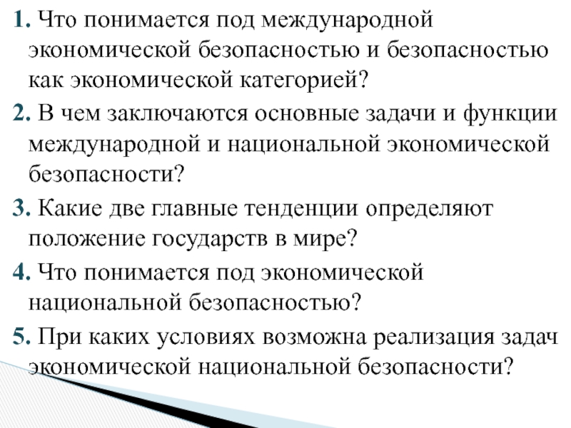 Слайд 401. Что понимается под международной экономической безопасностью и безопасностью как
