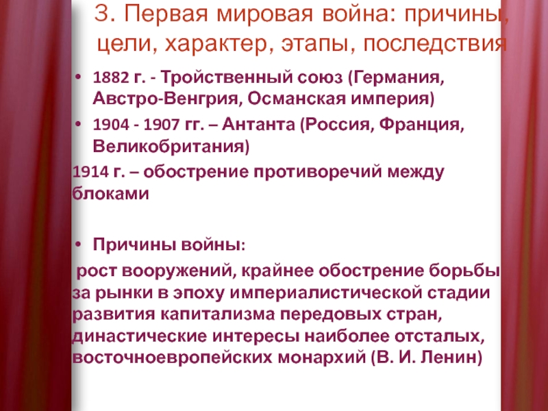 рост вооружений, крайнее обострение борьбы за рынки в эпоху империалистической стадии развития капитализма передовых стран, династические интересы наиболее отсталых, восточноевропейских монархий (В. И. Ленин)