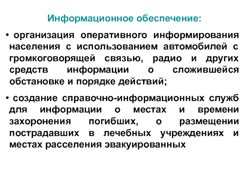 создание справочно-информационных служб для информации о местах и времени захоронения погибших, о размещении пострадавших в лечебных учреждениях и местах расселения эвакуированных