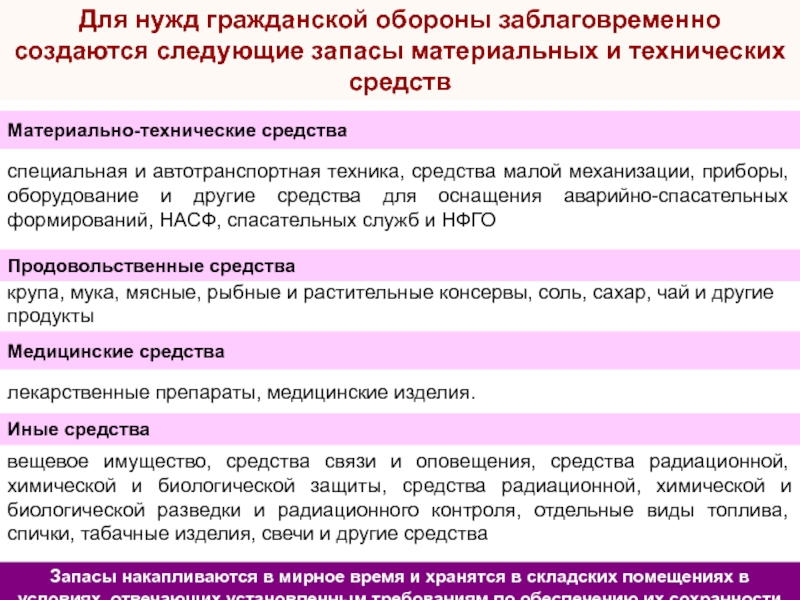 Слайд 9Для нужд гражданской обороны заблаговременно создаются следующие запасы материальных и