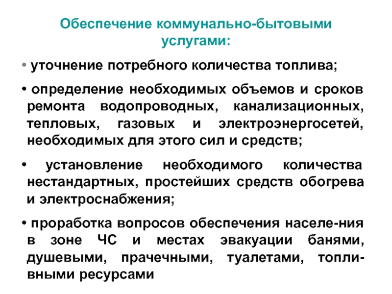 проработка вопросов обеспечения населе-ния в зоне ЧС и местах эвакуации банями, душевыми, прачечными, туалетами, топли-вными ресурсами