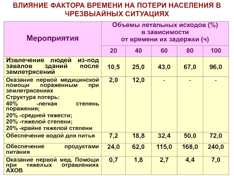 Слайд 34ВЛИЯНИЕ ФАКТОРА ВРЕМЕНИ НА ПОТЕРИ НАСЕЛЕНИЯ В ЧРЕЗВЫАЙНЫХ СИТУАЦИЯХ