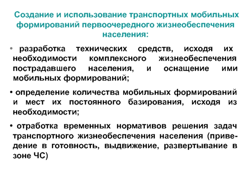 Слайд 42Создание и использование транспортных мобильных формирований первоочередного жизнеобеспечения населения: