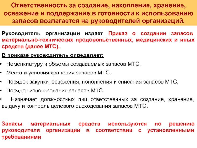 Запасы создаются Приказами руководителей организаций, отнесенных к категориям по гражданской обороны