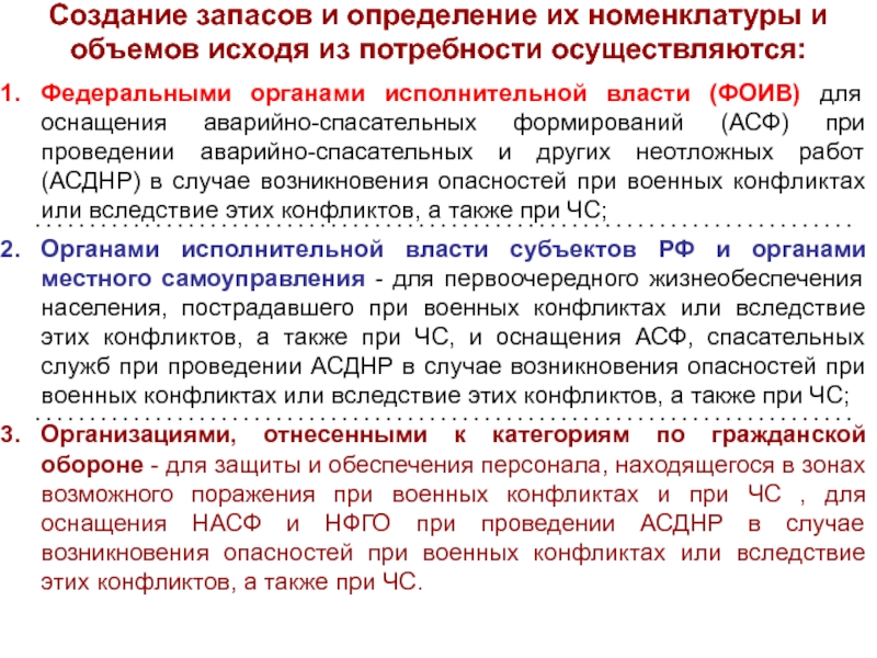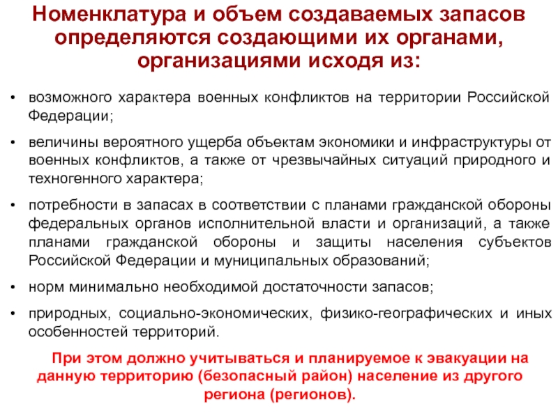 Объемы и номенклатура запасов определяютяс исходя из возможного характера военных конфликтов на территории РФ, величины возможного ущерба, природных, экономических, физико-географических и иных особенностей территорий, условий размещения организаций, а также норм минимально необходимой достаточности запасов