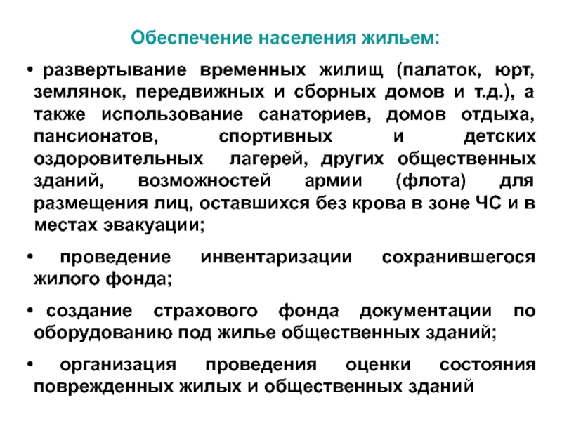 отдыха, пансионатов, спортивных и детских оздоровительных лагерей, других общественных зданий, возможностей армии (флота) для размещения лиц, оставшихся без крова в зоне ЧС и в местах эвакуации;