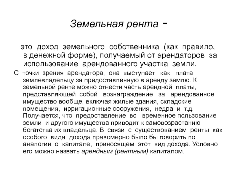 С точки зрения арендатора, она выступает как плата землевладельцу за предоставленную в аренду землю. К земельной ренте можно отнести часть арендной платы, представляющей собой вознаграждение за арендованное имущество вообще, включая жилые здания, складские помещения, ирригационные сооружения, недра и т.д. Получается, что предоставление во временное пользование земли и другого имущества приводит к самовозрастанию богатства их владельца. В связи с существованием ренты как особого вида дохода правомерно было бы говорить по аналогии о капитале, приносящем этот вид дохода. Условно его можно назвать арендным (рентным) капиталом.