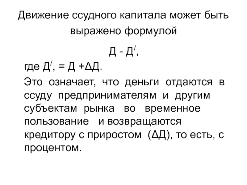 Это означает, что деньги отдаются в ссуду предпринимателям и другим субъектам рынка во временное пользование и возвращаются кредитору с приростом (Д), то есть, с процентом.