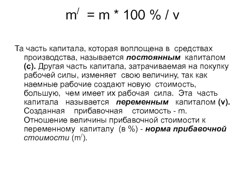 Другая часть капитала, затрачиваемая на покупку рабочей силы, изменяет свою величину, так как наемные рабочие создают новую стоимость, большую, чем имеет их рабочая сила. Эта часть капитала называется переменным капиталом (v). Созданная прибавочная стоимость - m. Отношение величины прибавочной стоимости к переменному капиталу (в %) - норма прибавочной стоимости (m/).