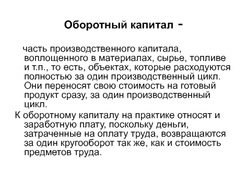 К оборотному капиталу на практике относят и заработную плату, поскольку деньги, затраченные на оплату труда, возвращаются за один кругооборот так же, как и стоимость предметов труда.