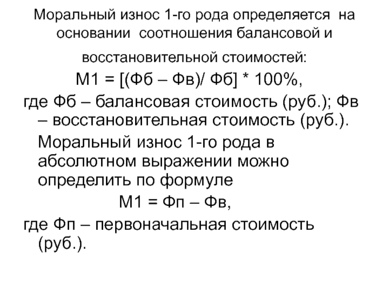 Слайд 45Моральный износ 1-го рода определяется на основании соотношения балансовой и