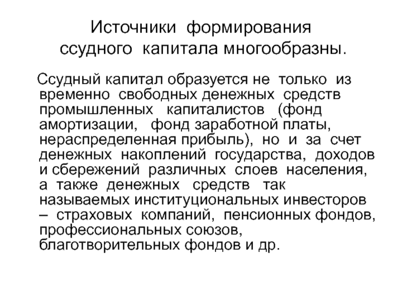 (фонд амортизации, фонд заработной платы, нераспределенная прибыль), но и за счет денежных накоплений государства, доходов и сбережений различных слоев населения, а также денежных средств так называемых институциональных инвесторов – страховых компаний, пенсионных фондов, профессиональных союзов, благотворительных фондов и др.