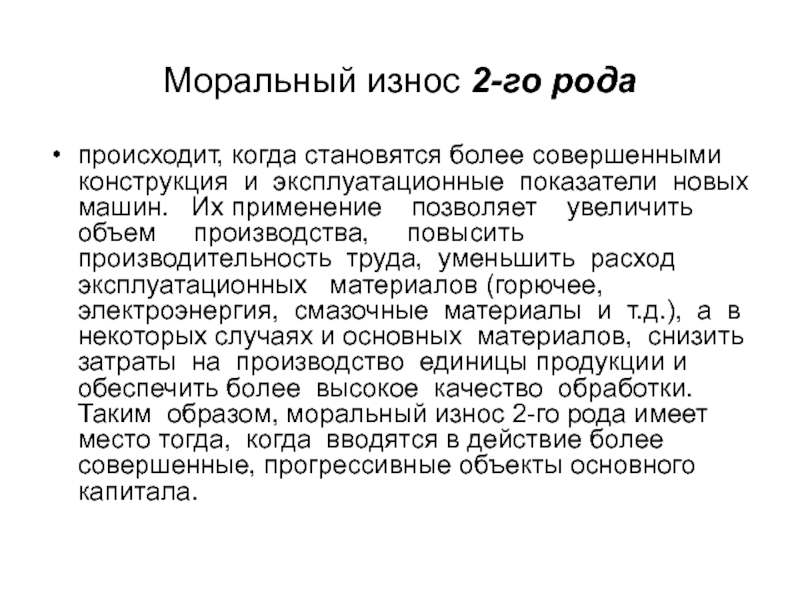увеличить объем производства, повысить производительность труда, уменьшить расход эксплуатационных материалов (горючее, электроэнергия, смазочные материалы и т.д.), а в некоторых случаях и основных материалов, снизить затраты на производство единицы продукции и обеспечить более высокое качество обработки. Таким образом, моральный износ 2-го рода имеет место тогда, когда вводятся в действие более совершенные, прогрессивные объекты основного капитала.