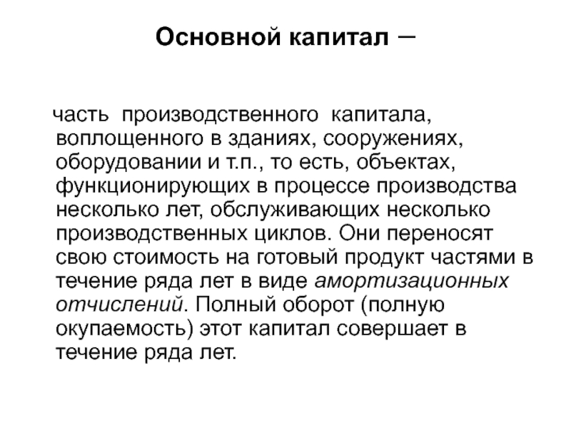 производства несколько лет, обслуживающих несколько производственных циклов. Они переносят свою стоимость на готовый продукт частями в течение ряда лет в виде амортизационных отчислений. Полный оборот (полную окупаемость) этот капитал совершает в течение ряда лет.