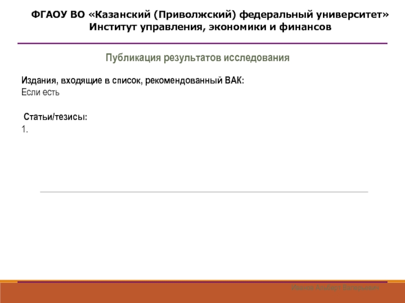 Иванов Альберт ВалерьевичИздания, входящие в список, рекомендованный ВАК:Если есть Статьи/тезисы:1. Публикация результатов исследованияФГАОУ ВО «Казанский (Приволжский) федеральный
