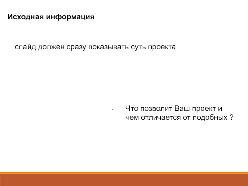 слайд должен сразу показывать суть проектаИсходная информацияЧто позволит Ваш проект и чем отличается от подобных ?