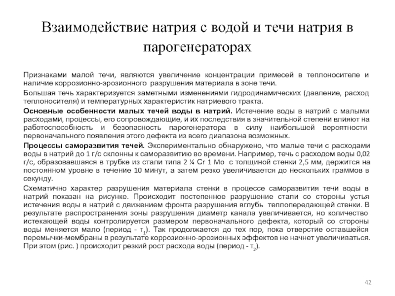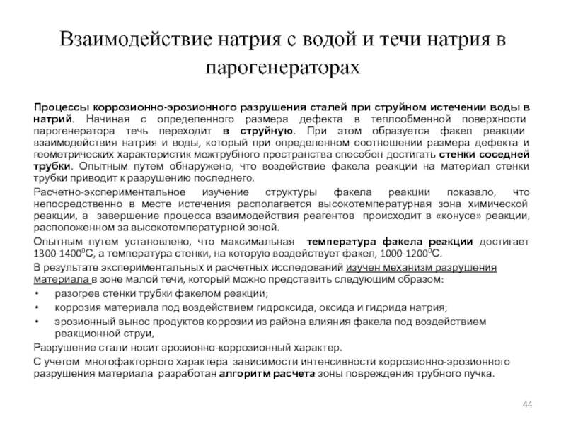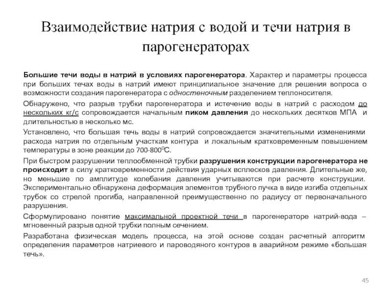 конструкционных материалов в натрии. Взаимодействие натрия с водой и течи натрия в парогенераторах. Течи натрия из контура, противопожарные мероприятия.