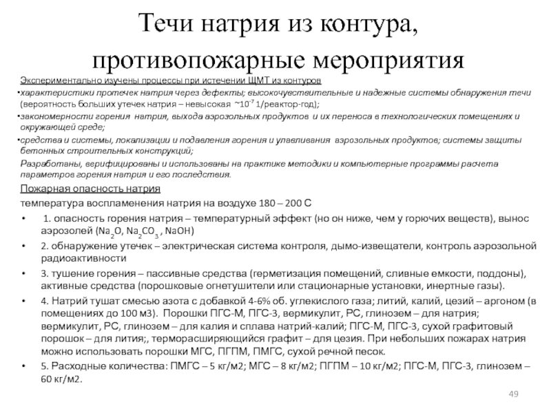 Слайд 59Течи натрия из контура, противопожарные мероприятия
