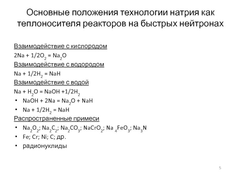 Слайд 5Основные положения технологии натрия как теплоносителя реакторов на быстрых нейтронах