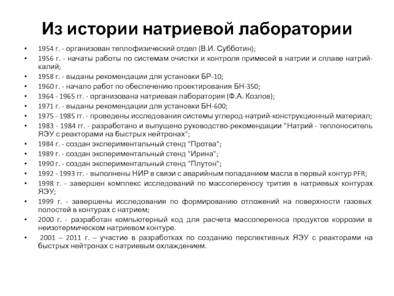 1964 - 1965 гг. - организована натриевая лаборатория (Ф.А. Козлов);