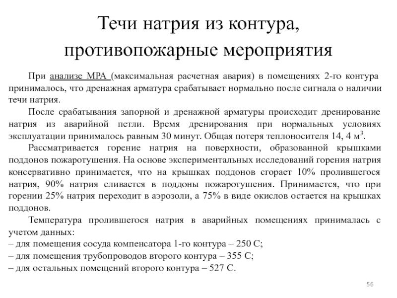 Слайд 56Течи натрия из контура, противопожарные мероприятия