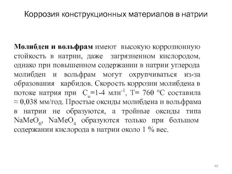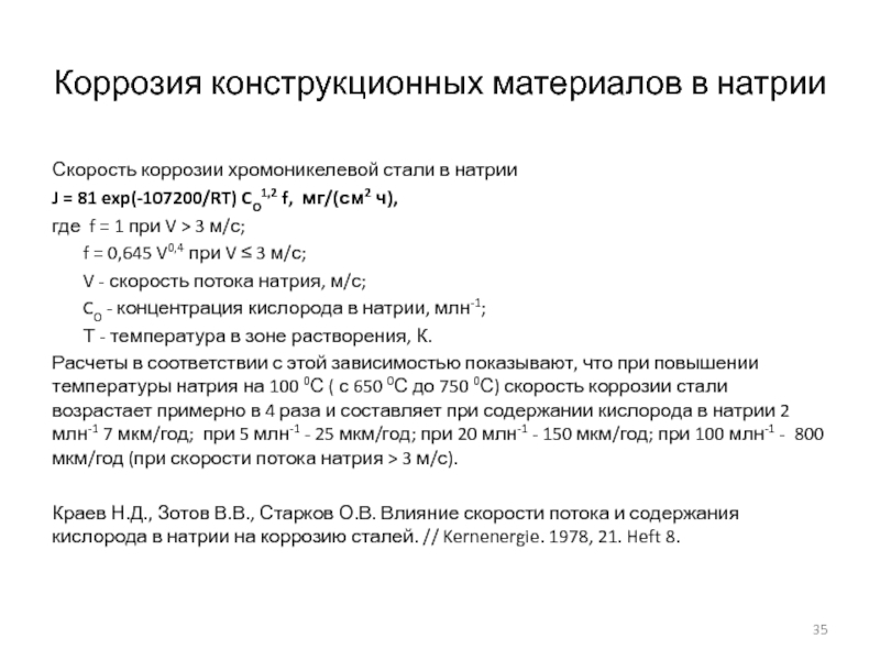 из холодной ловушки, которая вполне устойчиво работает при температуре 120-130 оС, что соответствует концентрации насыщения кислорода на уровне 1,5-2 ppm. На этом уровне и следует поддерживать концентрацию кислорода в натрии, чтобы свести к минимуму коррозию сталей, однако, учитывая различные ситуации с возможным поступлением кислорода во время ремонтов и разгерметизации контуров, содержание кислорода в натрии ограничено в ОСТе нормой 10 ppm.