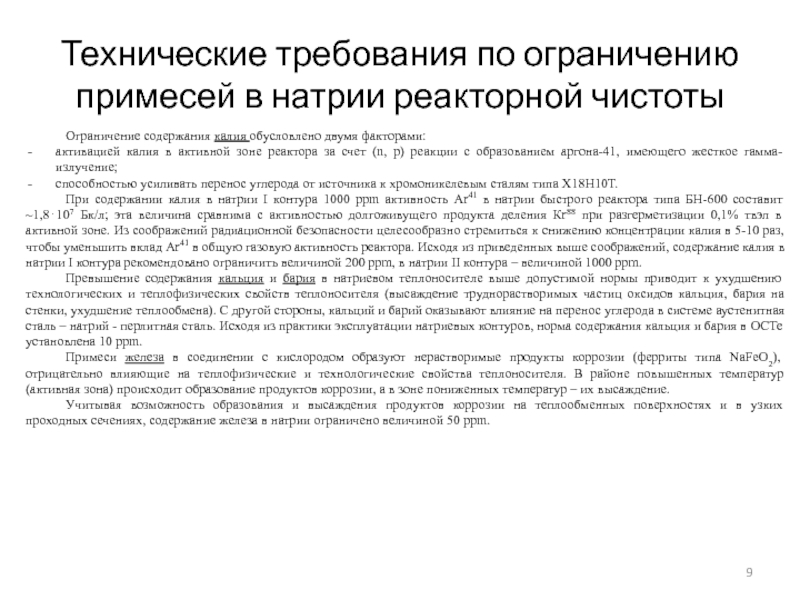 Слайд 8Технические требования по ограничению примесей в натрии реакторной чистоты