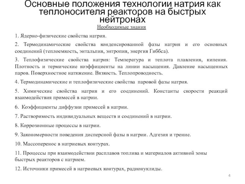 Слайд 4Основные положения технологии натрия как теплоносителя реакторов на быстрых нейтронах