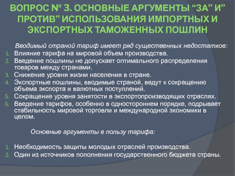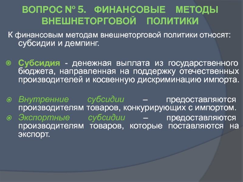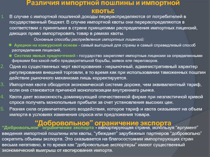 “Добровольное” ограничение экспорта - импортирующая страна, используя “аргумент” введения импортной пошлины или квоты, “убеждает” зарубежных партнеров “добровольно” сократить объемы экспорта. Это сказывается на благосостоянии импортирующих стран весьма негативно, в то время как “добровольные экспортеры” имеют существенный экономический выигрыш от квотирования импорта.