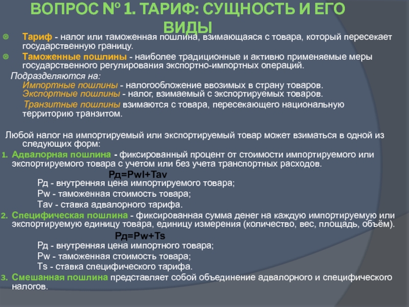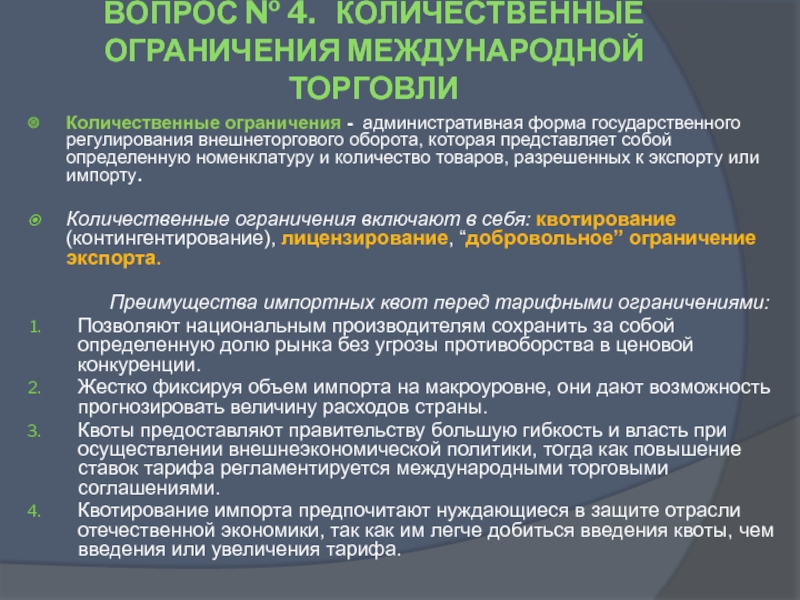 Одна из существенных черт квотирования - нерыночный, административный характер регулирования внешней торговли, в то время как при использовании таможенных пошлин действие рыночного механизма лишь корректируется.